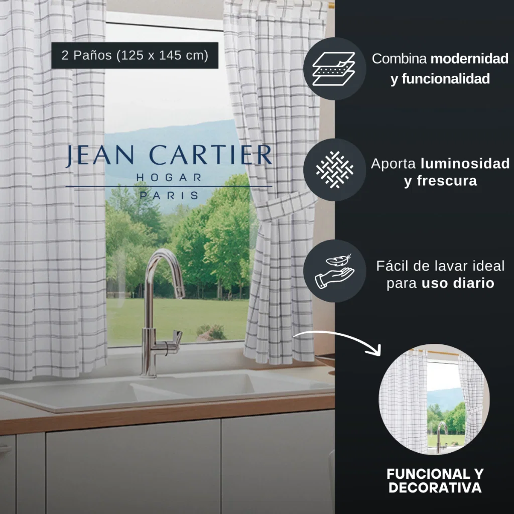 Juego de Cortinas de Cocina Cuadrícula de Jean Cartier es la elección perfecta para darle un toque fresco a tu cocina. Con un diseño estampado que combina modernidad y funcionalidad, estas cortinas están confeccionadas en 100% Microfibra Premium, garantizando durabilidad y suavidad.