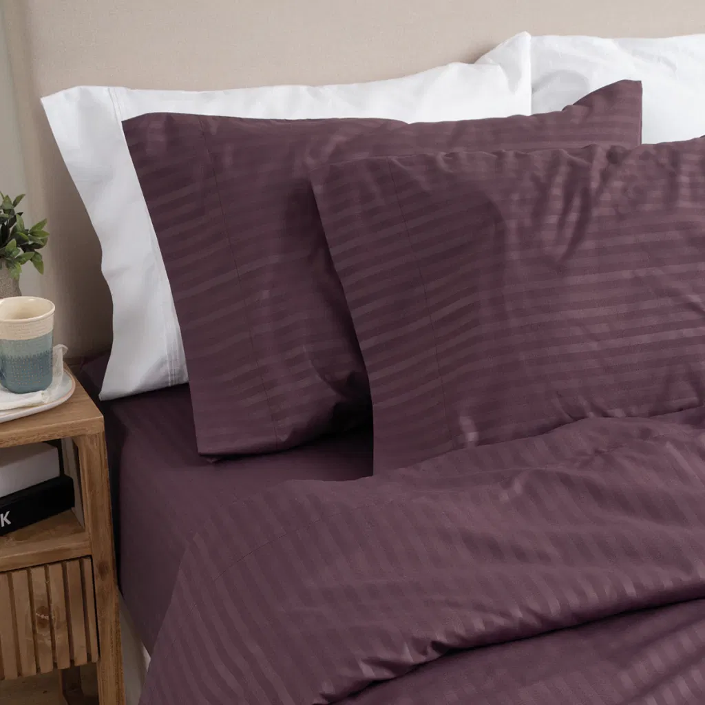 Viví la suavidad del tacto algodonoso con diseño a rayas símil DOBBY emboss, un juego de sábanas premium que combina confort, estilo y calidad superior para transformar tu descanso en una experiencia única.